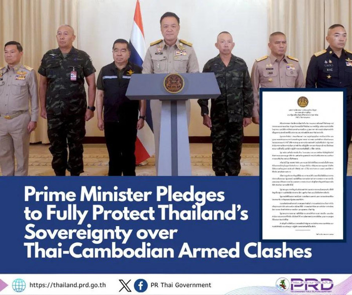 阿努廷甚至和三军将领一字排开,发表紧急全国电视讲话(这个造型和规格,以前只有国家政变时才有),摆出倾国一战的架势,并且首次明确提出,无论是东盟还是美国,都别插手。